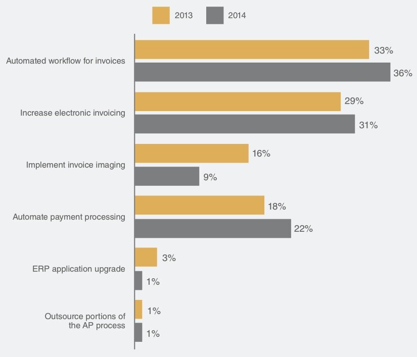 PayStream analysts are witnessing a trend towards more companies migrating to STP, and these companies are aiming high when it comes to AP automation goals. According to PayStream’s new eInvoice report titled Electronic Invoice Management: A Move to the Middle, the top accounts payable automation goals for 2014 is automated workflow for invoices (36 percent) and increase eInvoicing (31 percent), see figure below.